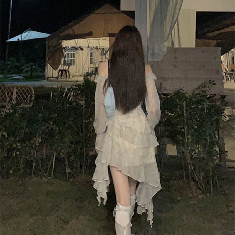 Y2K スタイル シックなフリル花柄プリント妖精ドレス長袖オフショルダー パーティー ドレス女性 ロング