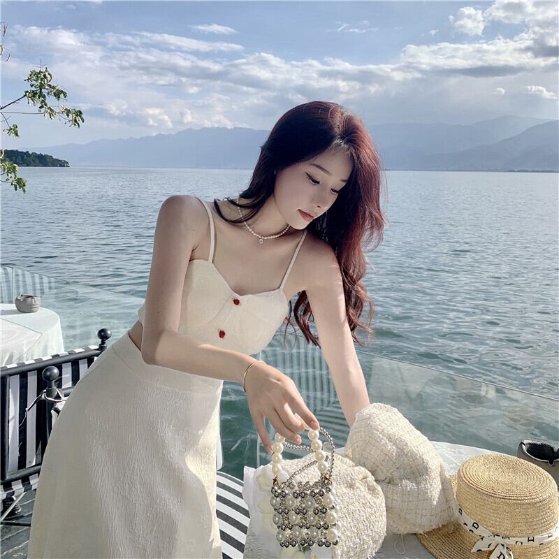 ジャカード 2 点セット: シックなスリング チューブ トップ + ベージュ A ライン ミディ スカート 2 点セット レディース衣装 Aライン