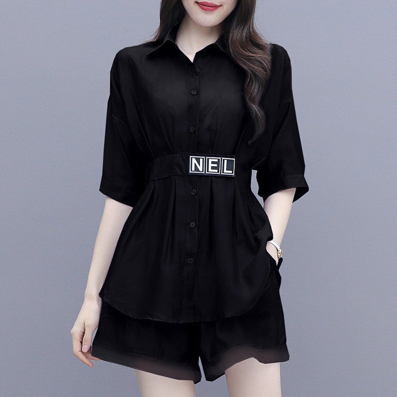 サマーオーガンジーツーピースセット レディース:シックなターンダウンカラーボタンシャツ+無地ショートパンツの2点セット 夏物 ソリッドカラー