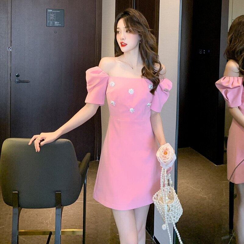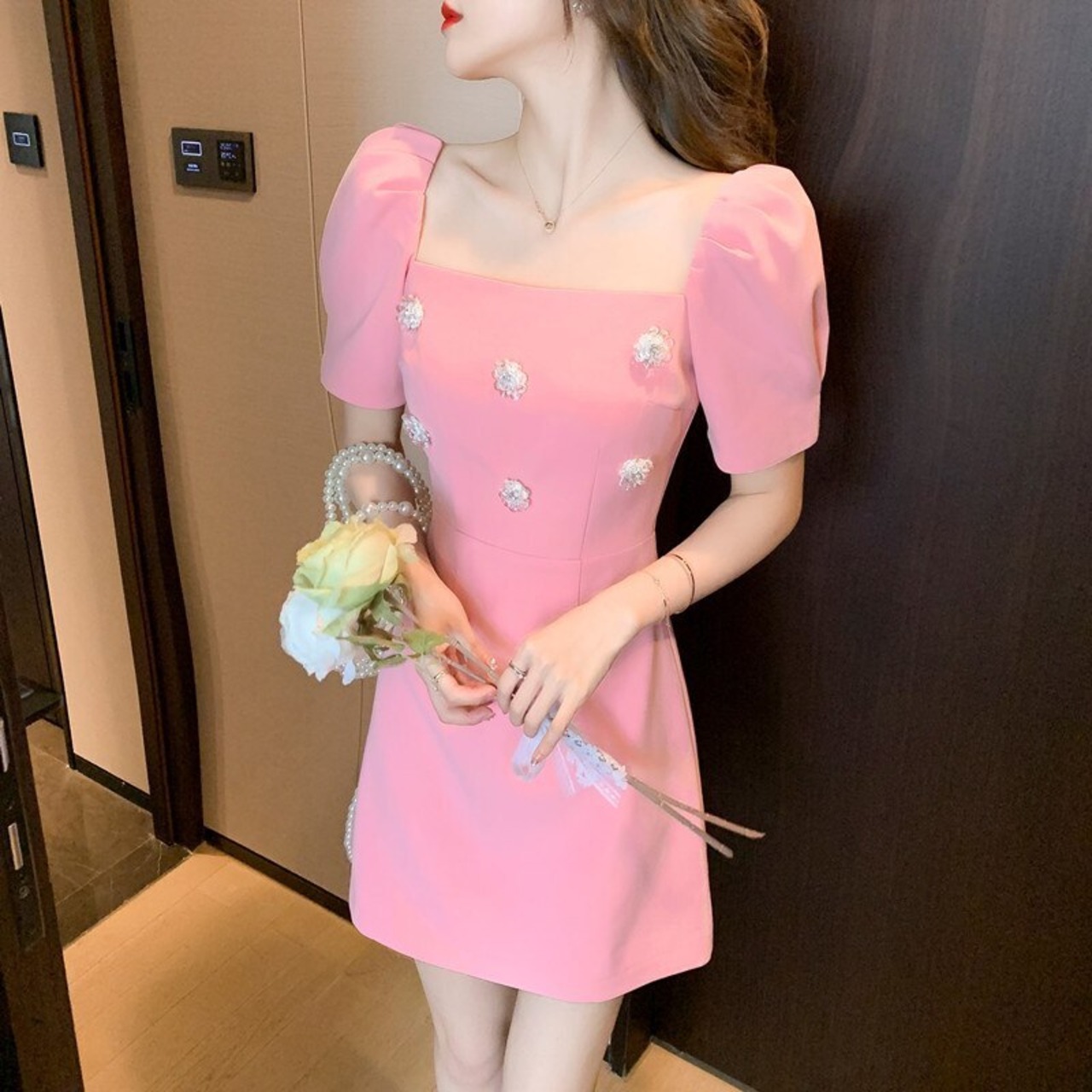 eseピンクミニドレス女性Y2kスクエアカラー半袖ミニドレス気質Aラインスリムドレス ショート ハーフスリーブ スクウェア