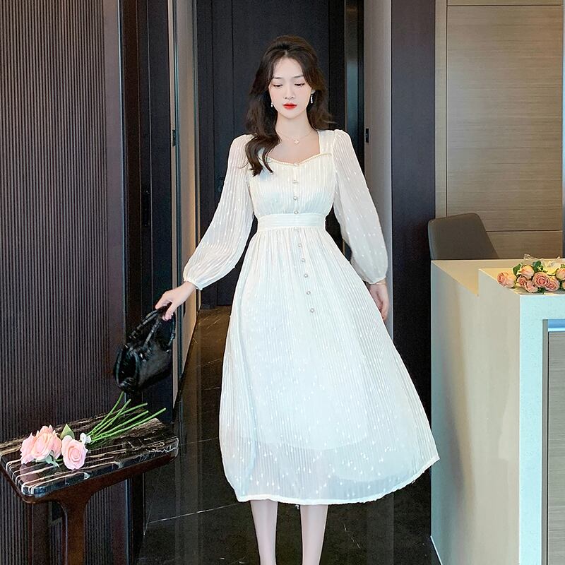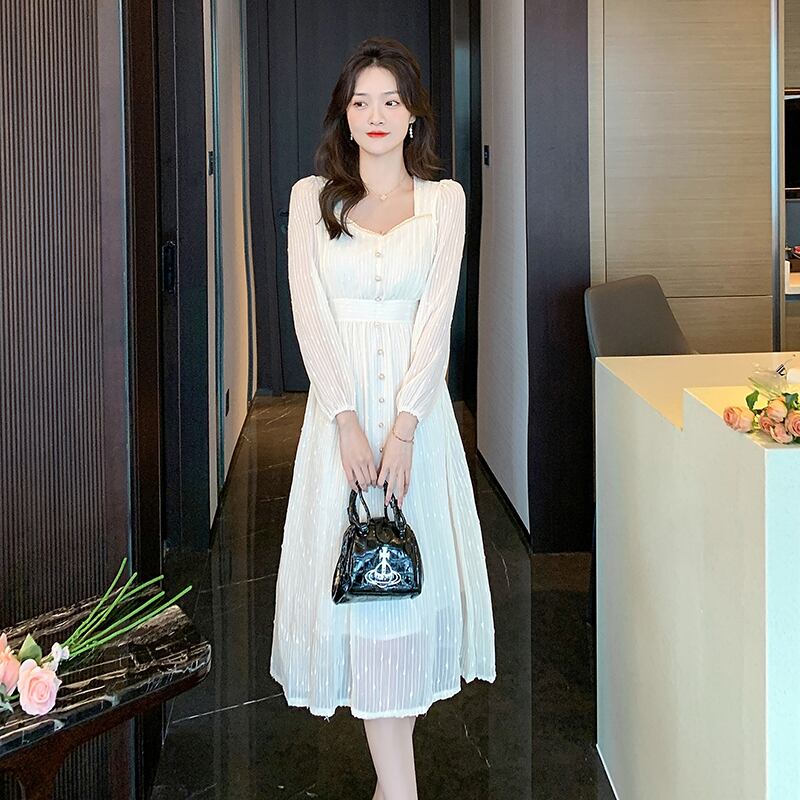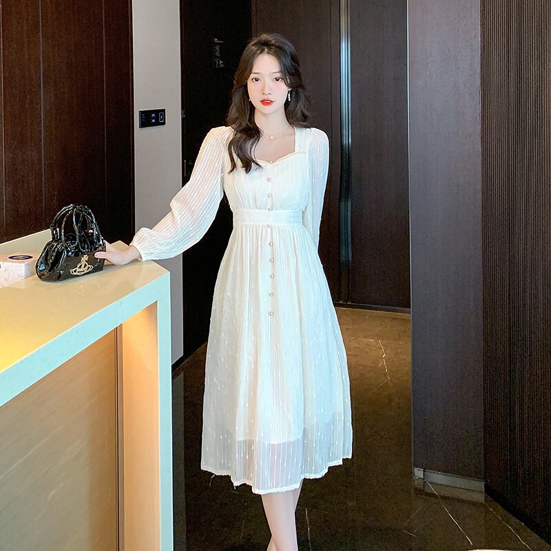 春夏ベージュ ミディ ドレス長袖スクエア カラー Y2k チュニック パーティー ウエディング ドレス ロング スプリング 春物 サマー 夏物 スクウェア