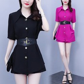 夏の 2 ピース パンツ セット: オフィス レディー ラペル シャツ blusa ベルト + ウエスト ショーツ 2 ピース セット サマー 夏物 ハーネス ブルマー 会社 学校 通勤や通学にも