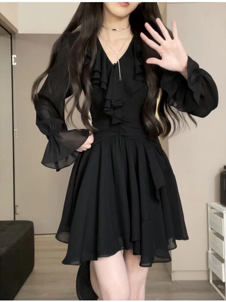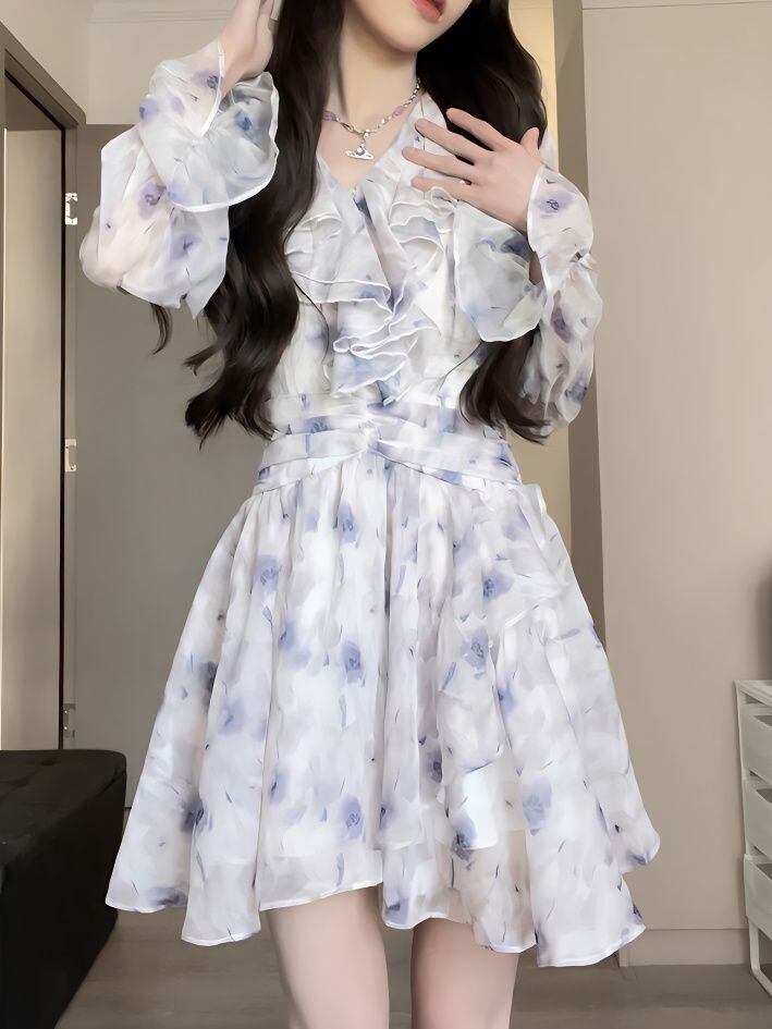 Y2K シックで妖精のドレスロング フリル袖花柄プリント不規則なシフォン ドレス ビーチ Vestido