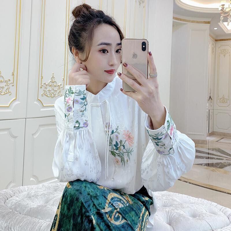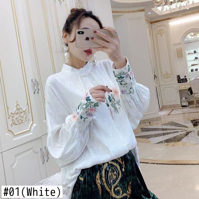 中国風改良された漢服トップ長袖ジャカード刺繍ルースブラウス - エンドレトロ唐スーツトップ ロング