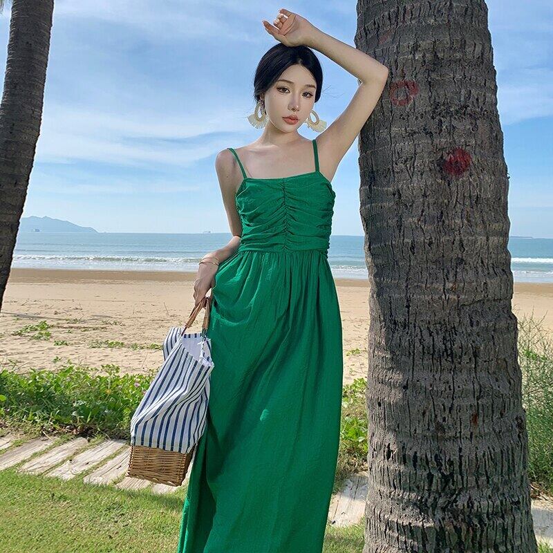 シックグリーンスプリットスパゲッティストラップマキシドレス背中開いたプリーツロングスリム因果ドレス