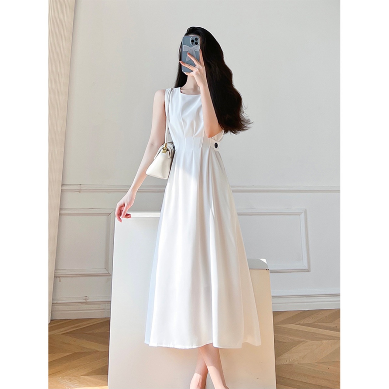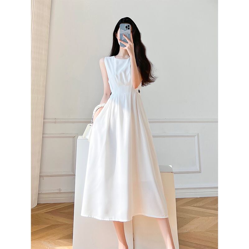 夏スタイルシック白黒ドレスノースリーブ O ネックチュニックパーティーウエディングドレス ホワイト ブラック サマー 夏物 Oネック