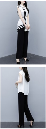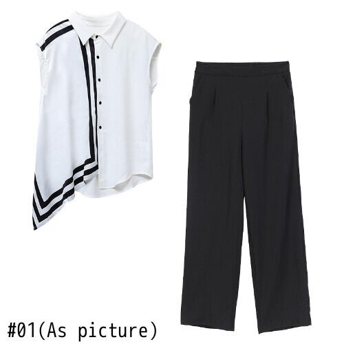 夏ラペル ストライプ不規則サテン ブラウス + ブラック ルーズ ストレート パンツ 2 点セット レディース衣装 サマー 夏物