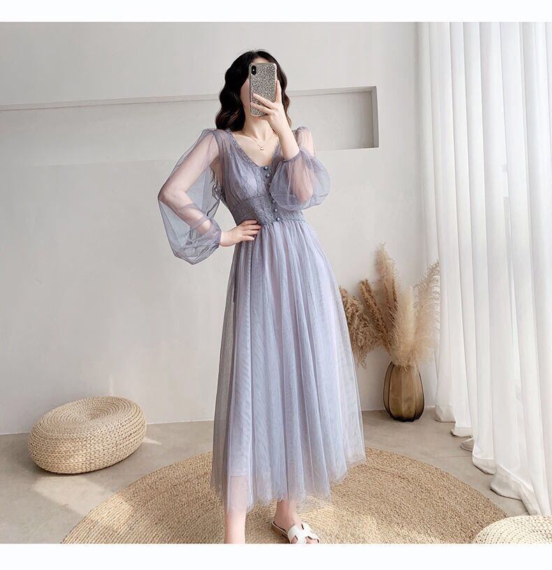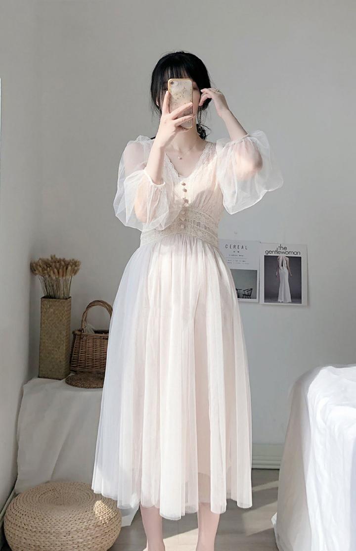 レースパッチワークメッシュウエストロングドレス夏パフスリーブ V ネックフレンチパーティースリムドレス Vestidos サマー 夏物 Vネック