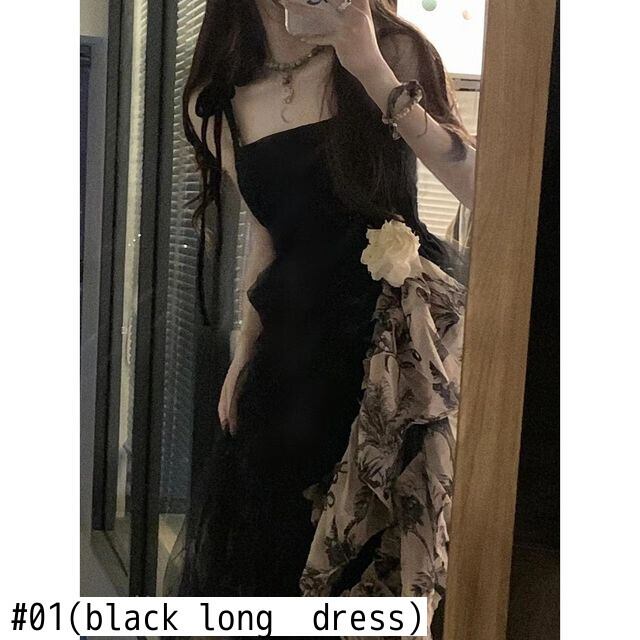 フランス花プリント黒ドレス夏スクエアネックステッチスリムシックロング Vestidos ブラック サマー 夏物 フラワーデザイン スクウェア