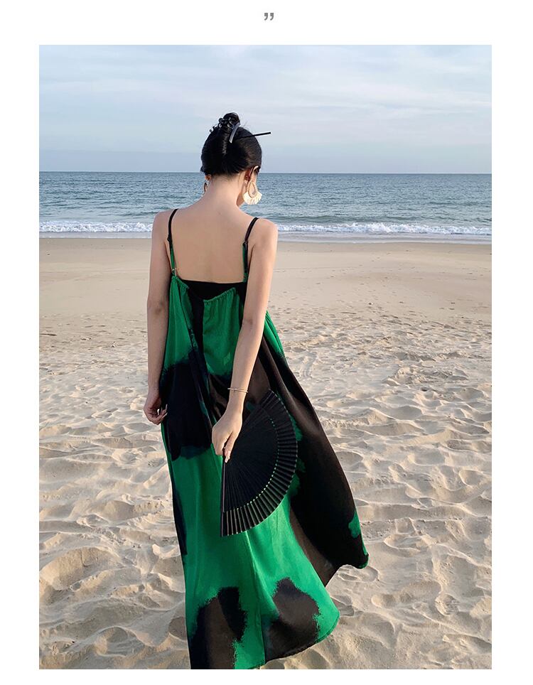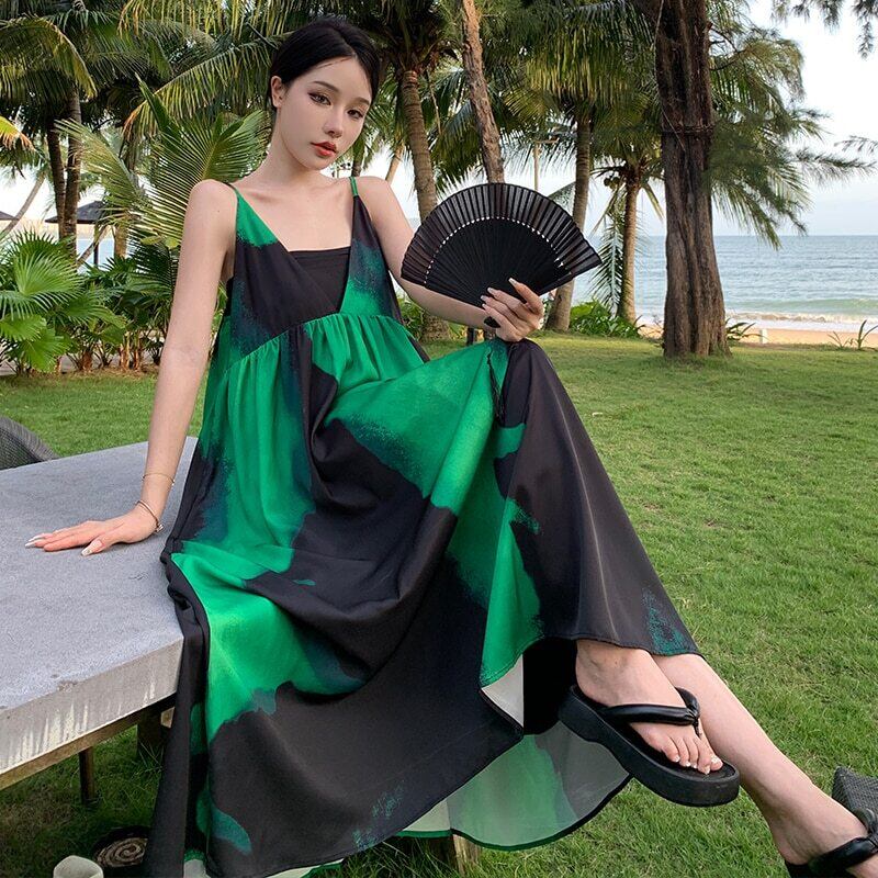 シックで Elgent 黒と緑絞り染めパーティードレスセクシー背中開いたルーズボヘミアンローブロングドレス ブラック グリーン