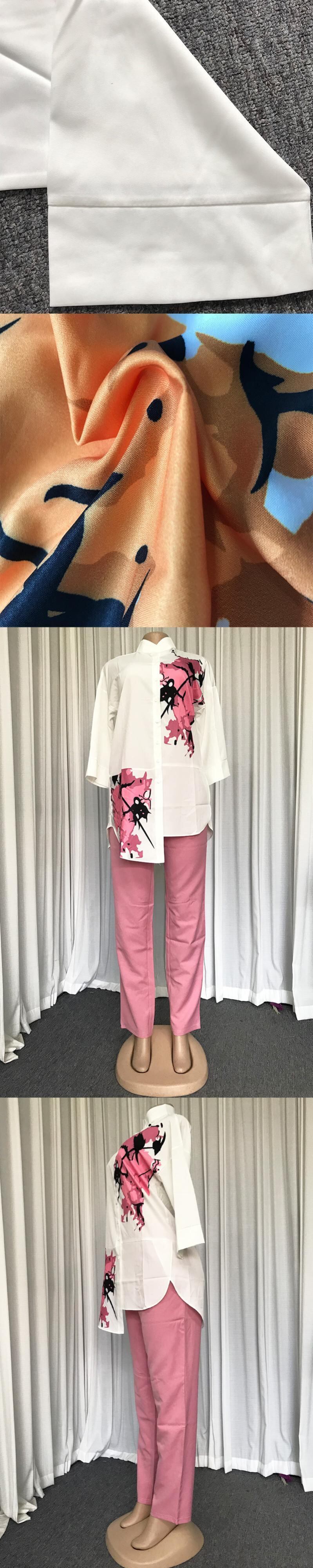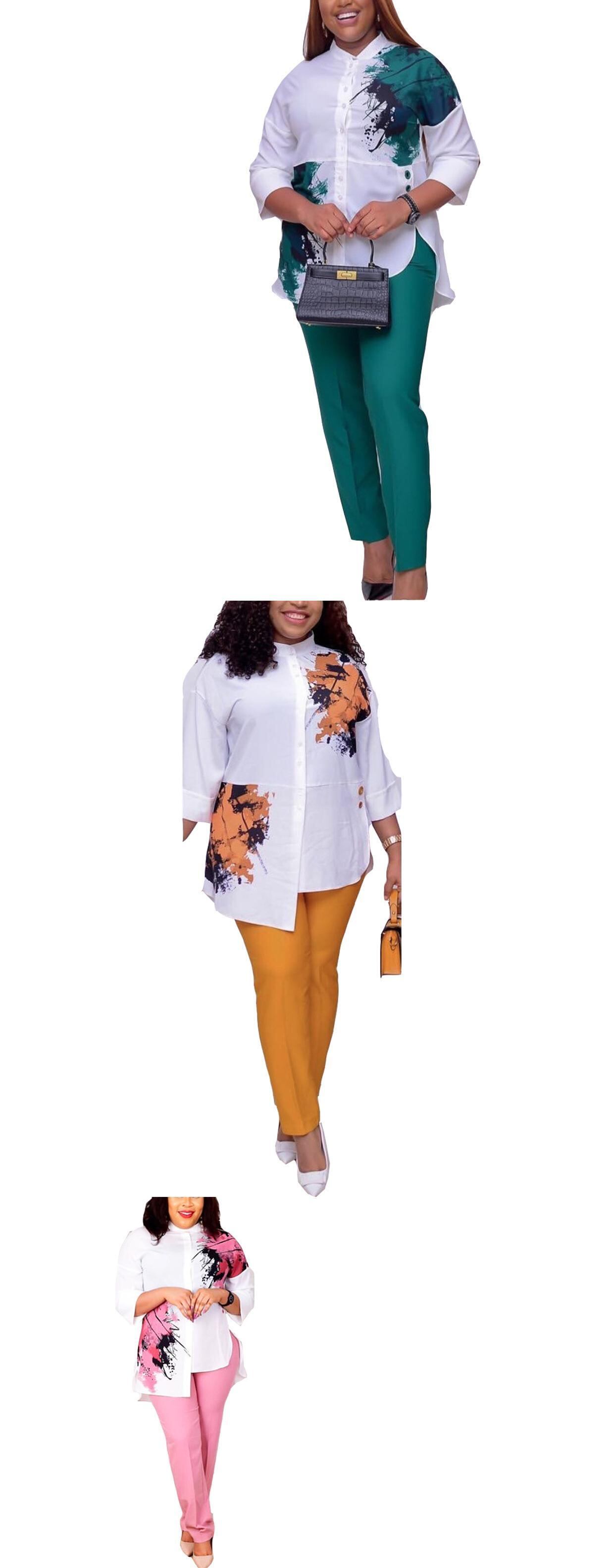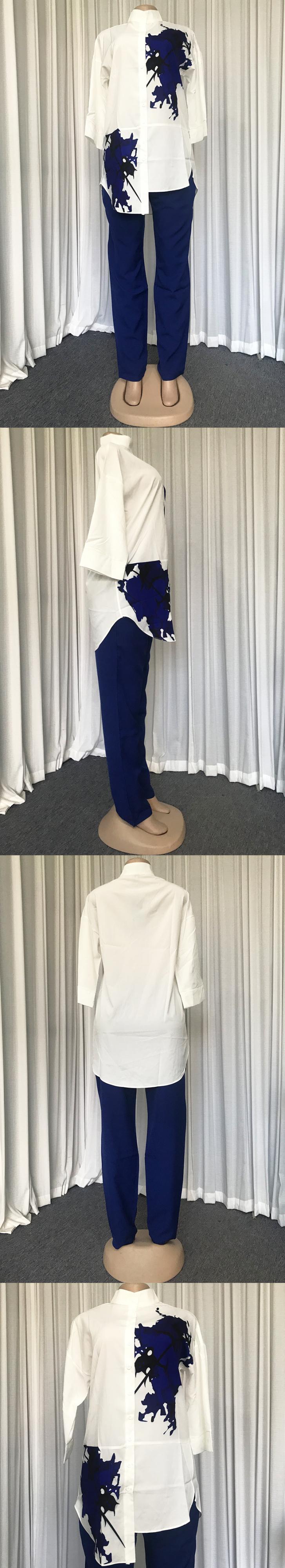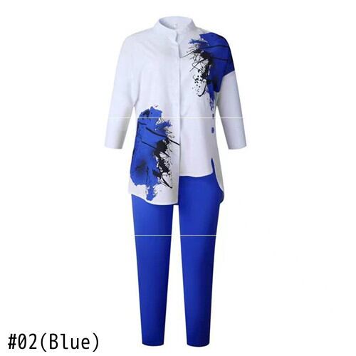 プラス サイズ アフリカ スタイル 2 点セット: 七分袖プリント イレギュラー トップ + 九点ペンシル パンツ 2 個セット 大きめサイズ