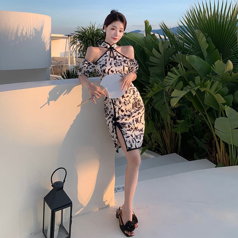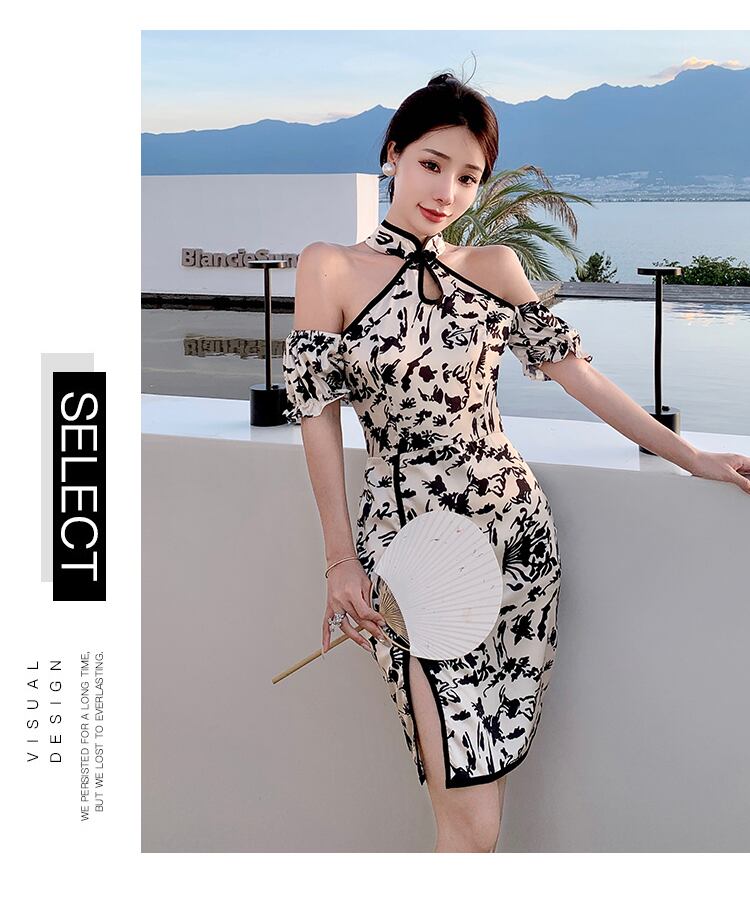 中国風プリントスリム袍ドレスレトロホルターネックワンショルダーセクシーミニドレス改良されたチャイナドレスパーティードレス