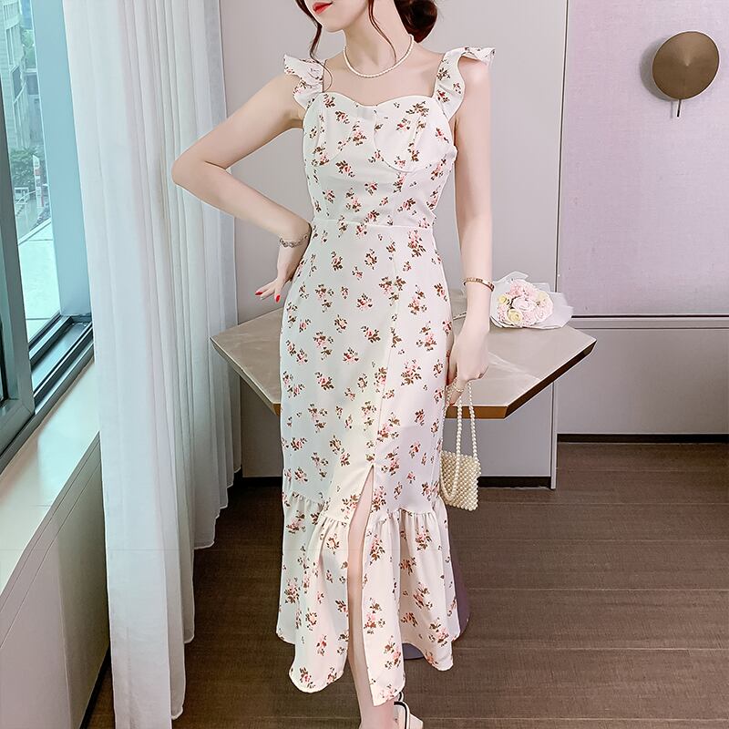 夏優しい風スプリット蓮葉スリーブスプリットシフォンフローラルサスペンダードレスホリデーレジャーサンドレス サマー 夏物 花柄
