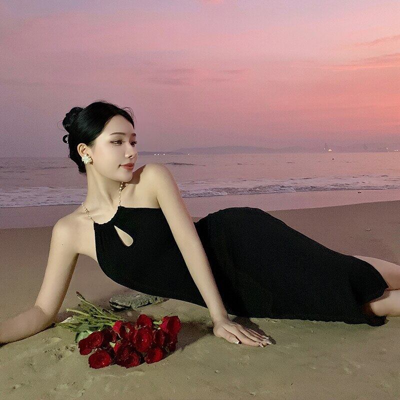 Y2K 夏セクシーストラップレスパール中空サスペンダードレスブラックハンギングネックスリムスリットニットドレスパーティー サマー 夏物 真珠