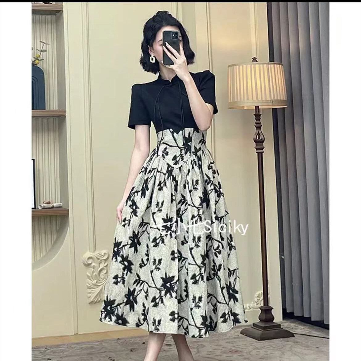 夏プリントチュニックロングドレス中国レトロスタンドカラーパッチワークスリムパーティーイブニングドレス サマー 夏物