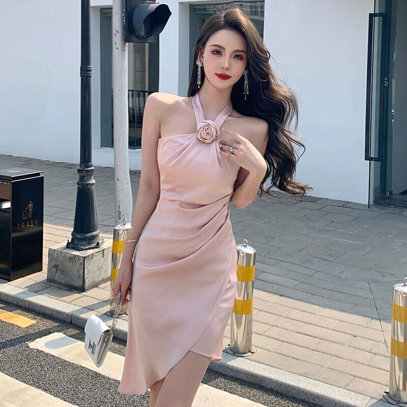 ローズホルターネックピンクパーティードレス夏セクシー背中開いたプリーツ不規則スリムシックウエディングドレス サマー 夏物