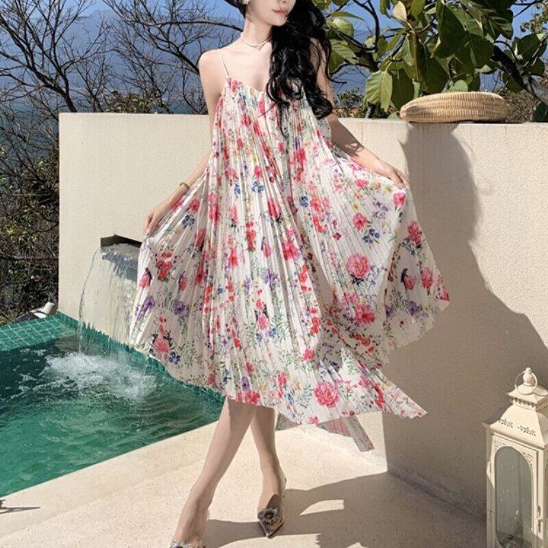 夏ルースくしゃくしゃスリング ドレス花柄プリント ビーチ ホリデー プリーツ ドレス Vestidos サマー 夏物