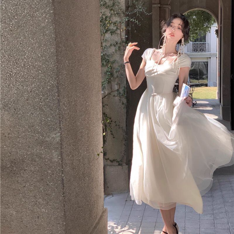 妖精メッシュ ステッチ ドレススクエア カラー無地チュニック ロング イブニング パーティー ドレス ソリッドカラー スクウェア