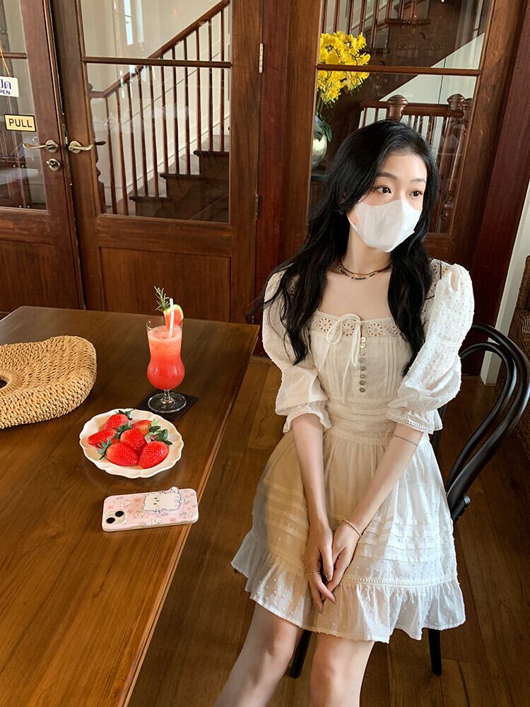 レディース スクエアカラー パフスリーブ ミニ Aラインワンピース Y2K ChicTwo-Wear 無地 五分袖 フリル ショートワンピース 半袖 ハーフスリーブ ラッフル ソリッドカラー スクウェア