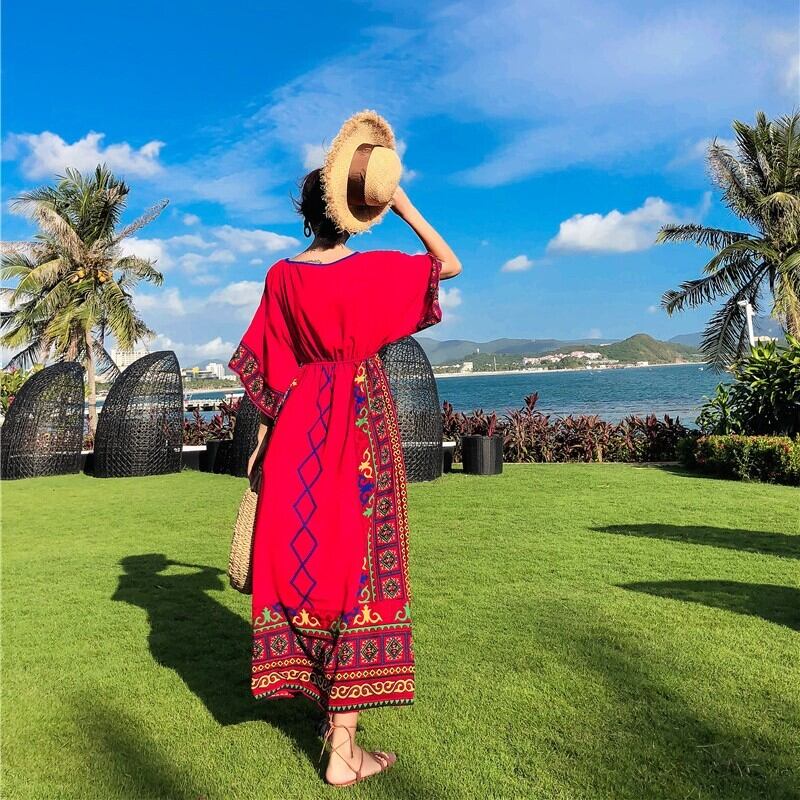 夏ボヘミアン ビーチ ホリデー ドレス V ネック半袖タイ メキシカン プリント ルーズ ドレス ショート ハーフスリーブ サマー 夏物 Vネック