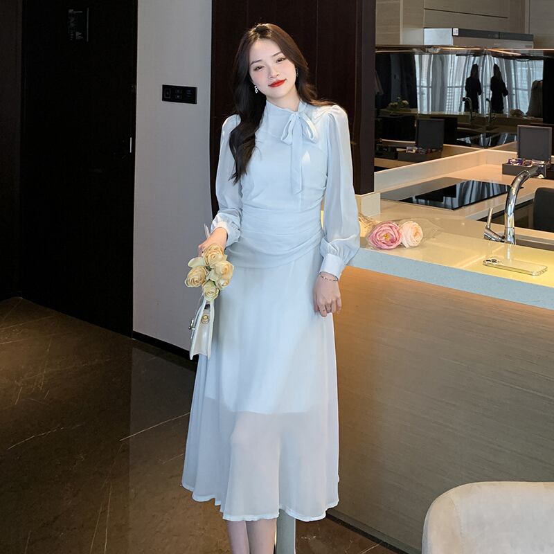 シックボウネックミッドレングスシフォンドレス春夏パフスリーブシャーリングウエストローブドレス リボン スプリング 春物 サマー 夏物