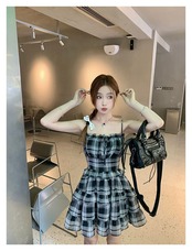 シック甘い黒格子縞ストラップドレス Y2K スクエアネックレースアップミニドレス ブラック 大人ガーリー スウィート キュート カジュアル スクウェア