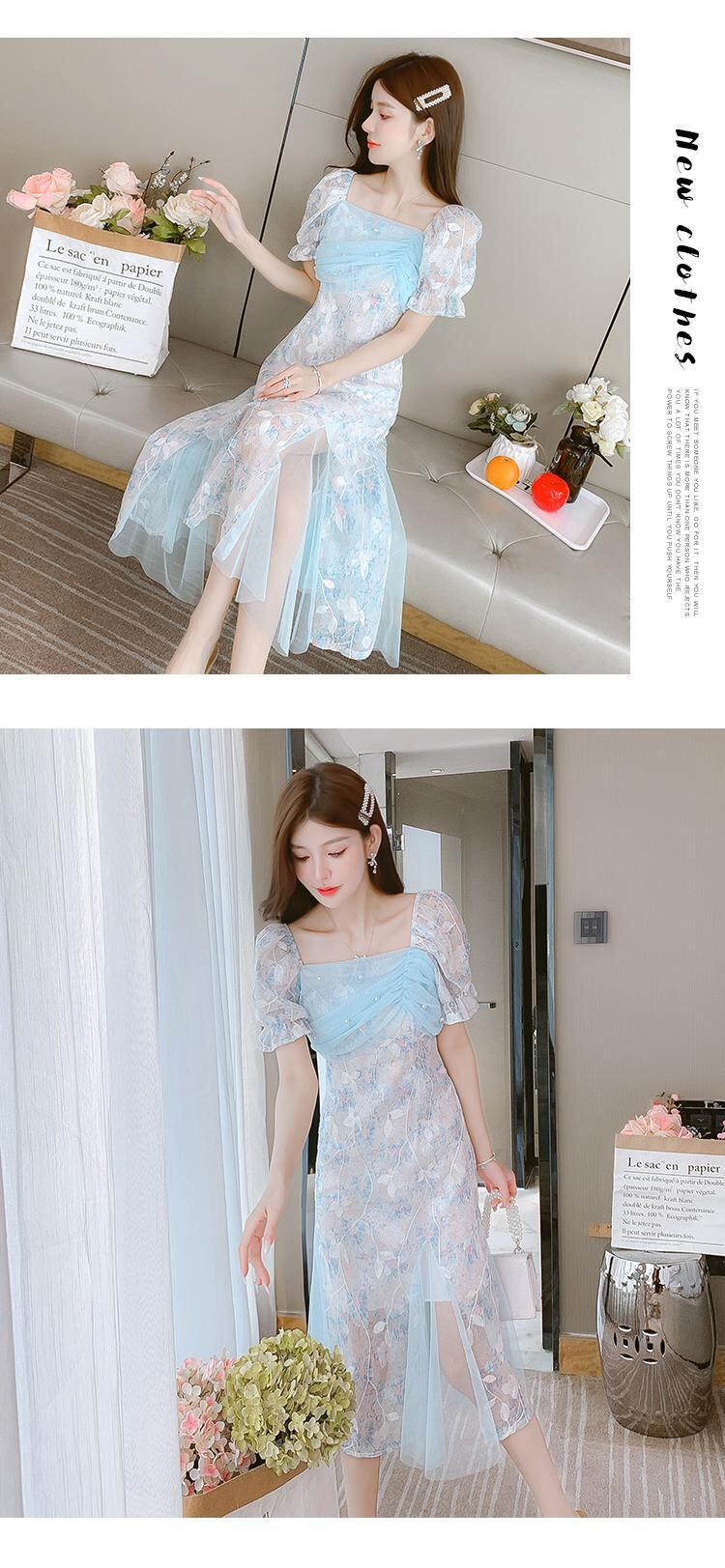 トレンドブルーアプリコットメッシュスリットガールズドレスレディースサマースクエアネック半袖パーティードレス ショート ハーフスリーブ 夏物 スクウェア