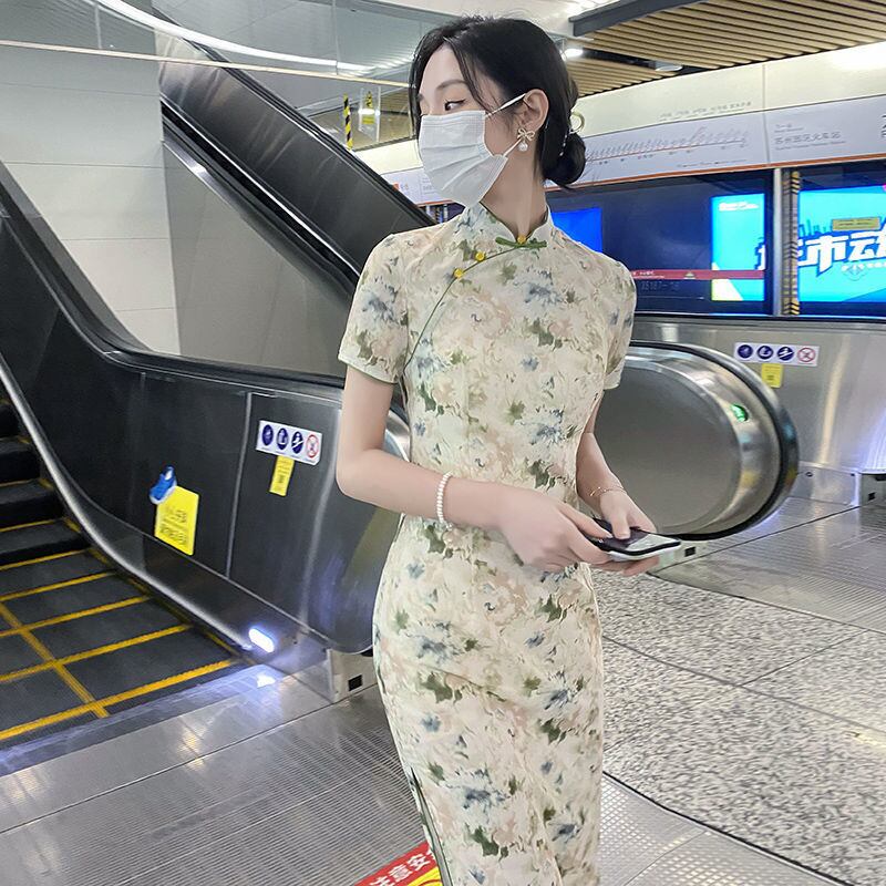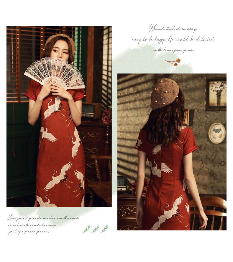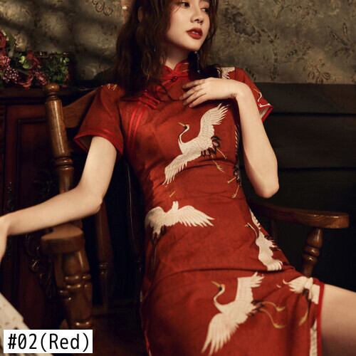 中国風赤鶴プリント改良されたチャイナドレスレトロバックル半袖レディーイヤーパーティースリムドレス ショート レッド ハーフスリーブ