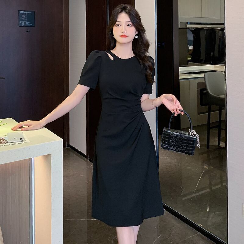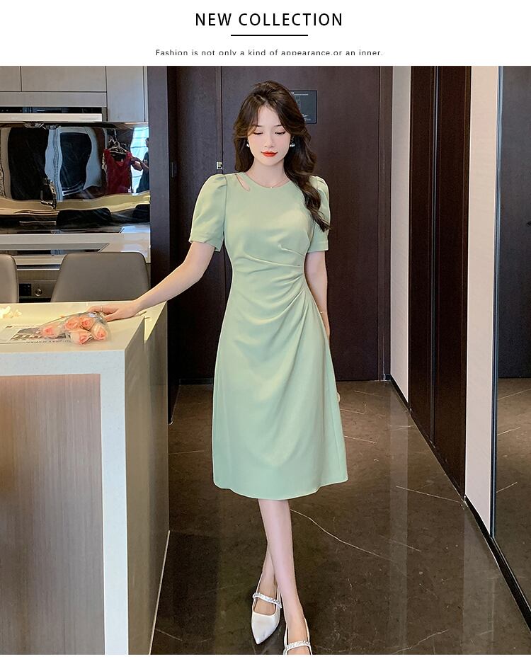 スタイルシックで無地パーティードレス夏 O ネック半袖スリムプリーツウエディングドレス ショート ハーフスリーブ サマー 夏物 Oネック ソリッドカラー