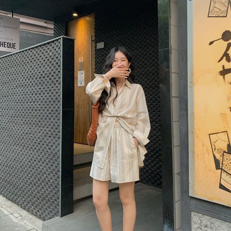 夏物レディースストライプツーピースセット:長袖ラペルルーズブラウス+ウエストワイドレッグショートパンツセット ロング サマー