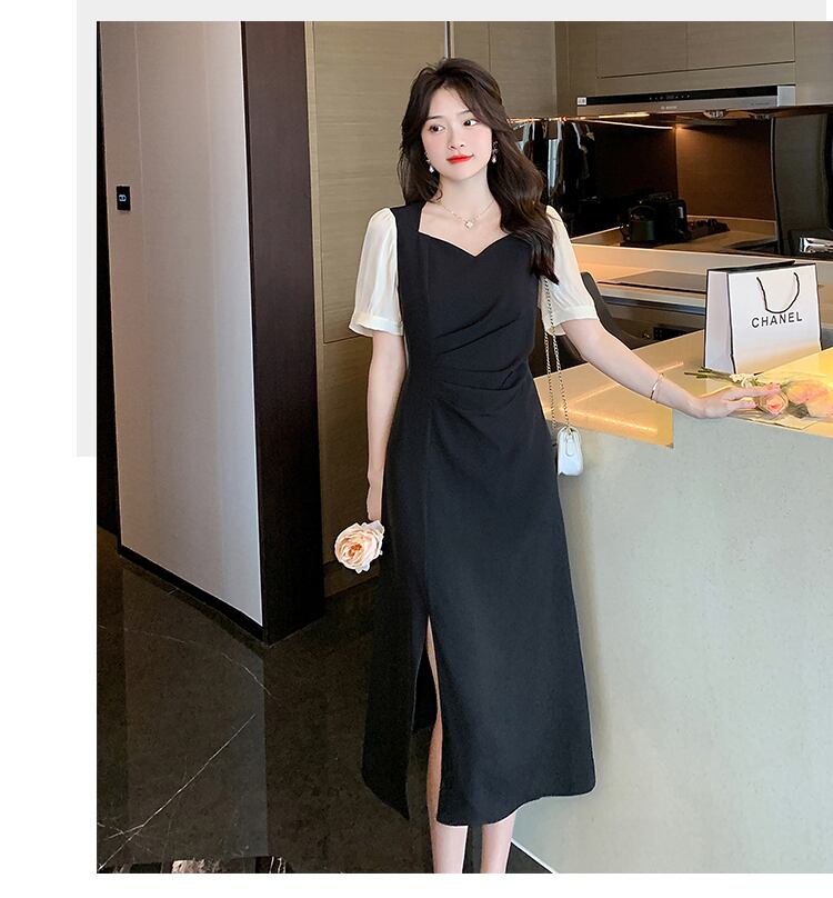 ブラックスクエアカラーミッドレングスパーティードレス半袖オフィススリムスリットドレス ショート ハーフスリーブ スクウェア 会社 学校 通勤や通学にも