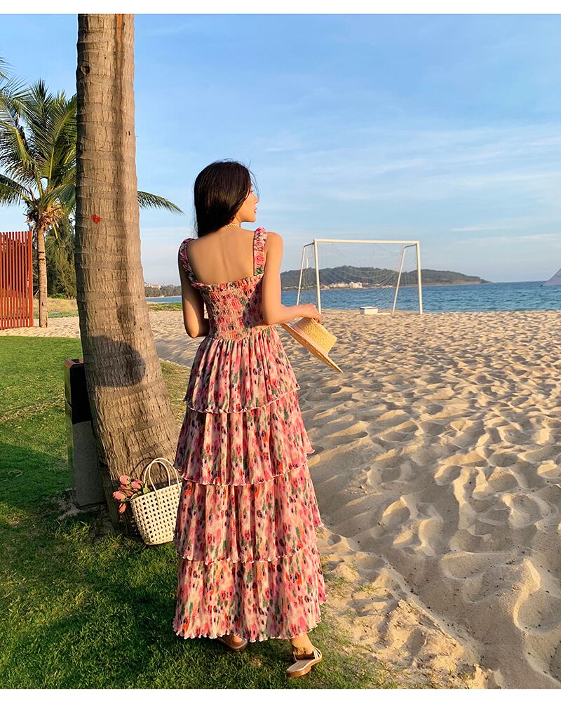 レトロ花柄プリント コルセット ビーチ バケーション スリング ロング ケーキ ドレス夏背中開いたスウィートとドレス 大人ガーリー キュート カジュアル サマー 夏物