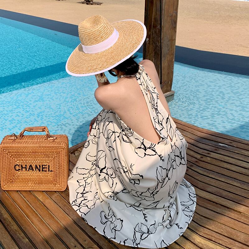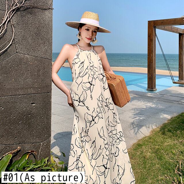 黒と白プリントホリデービーチドレス夏セクシー背中開いたホルターネックレースアップマキシドレス ホワイト ブラック サマー 夏物