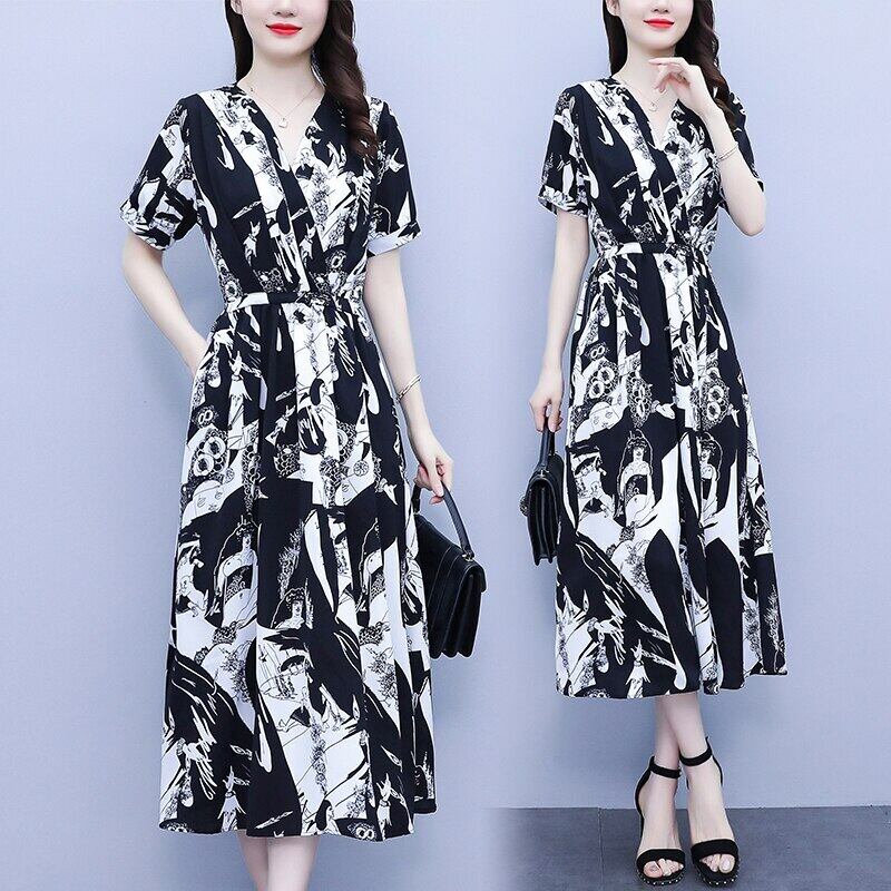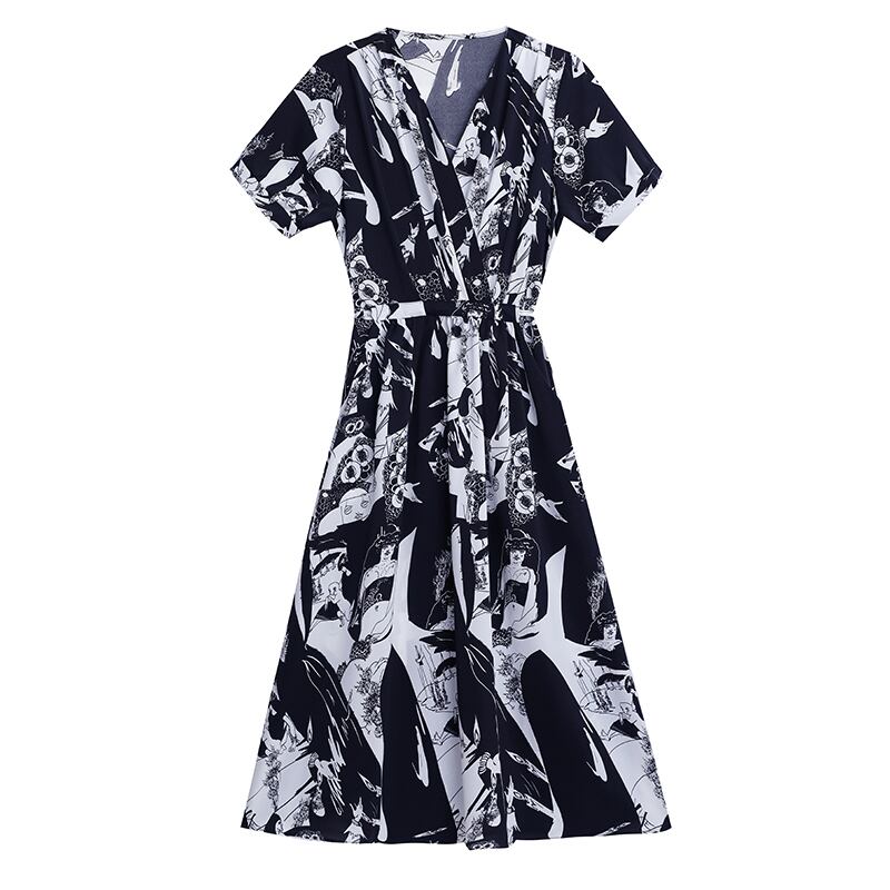 M-4XL Clic 黒と白プリントレースアップロングドレス V ネック半袖 A ラインドレス Vestidos ショート ホワイト ブラック ハーフスリーブ Vネック Aライン
