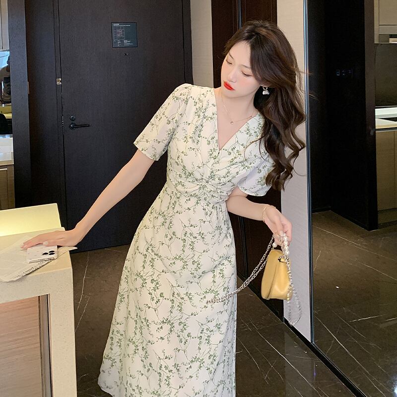 V ネックグリーン花柄プリントミッドレングスドレス夏オフィス半袖チュニックスリムドレス ショート ハーフスリーブ サマー 夏物 Vネック 会社 学校 通勤や通学にも