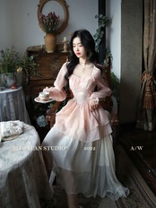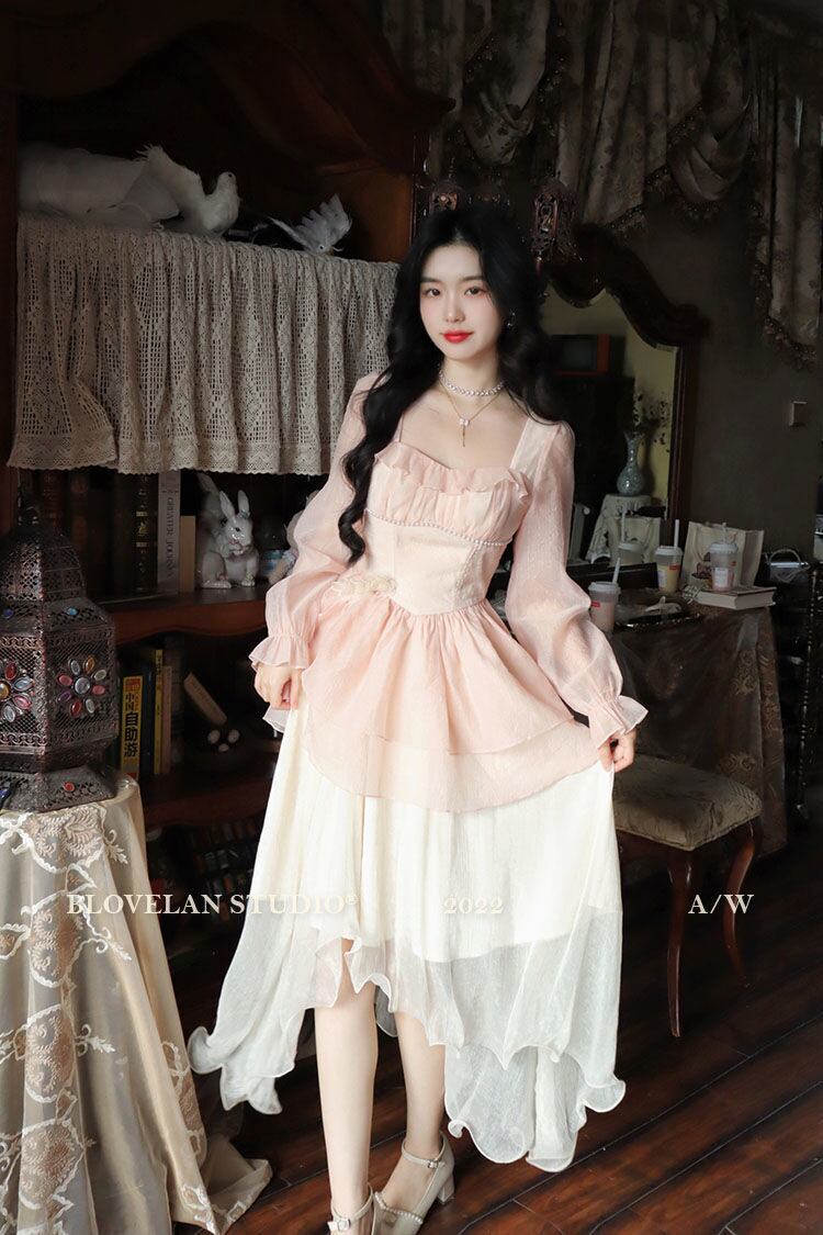 ピンクグラデーションチュニック不規則ロングプリンスドレス春秋長袖スクエアカラーパーティープロムドレス スプリング 春物 オータム 秋物 スクウェア