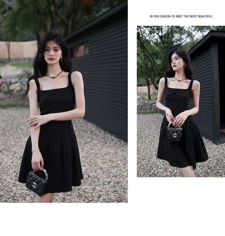 黒セクシースリムボディコンナイトクラブパーティーサスペンダードレス夏スクエアカラーチュニックスリムイブニングドレス ブラック サマー 夏物 スクウェア