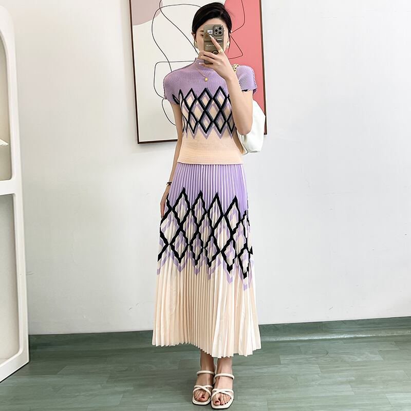 2 個セットタートルネックスリムすべて一致 T シャツ + ハイウエスト幾何学プリントスカートツーピースセット衣装 ハイウェスト
