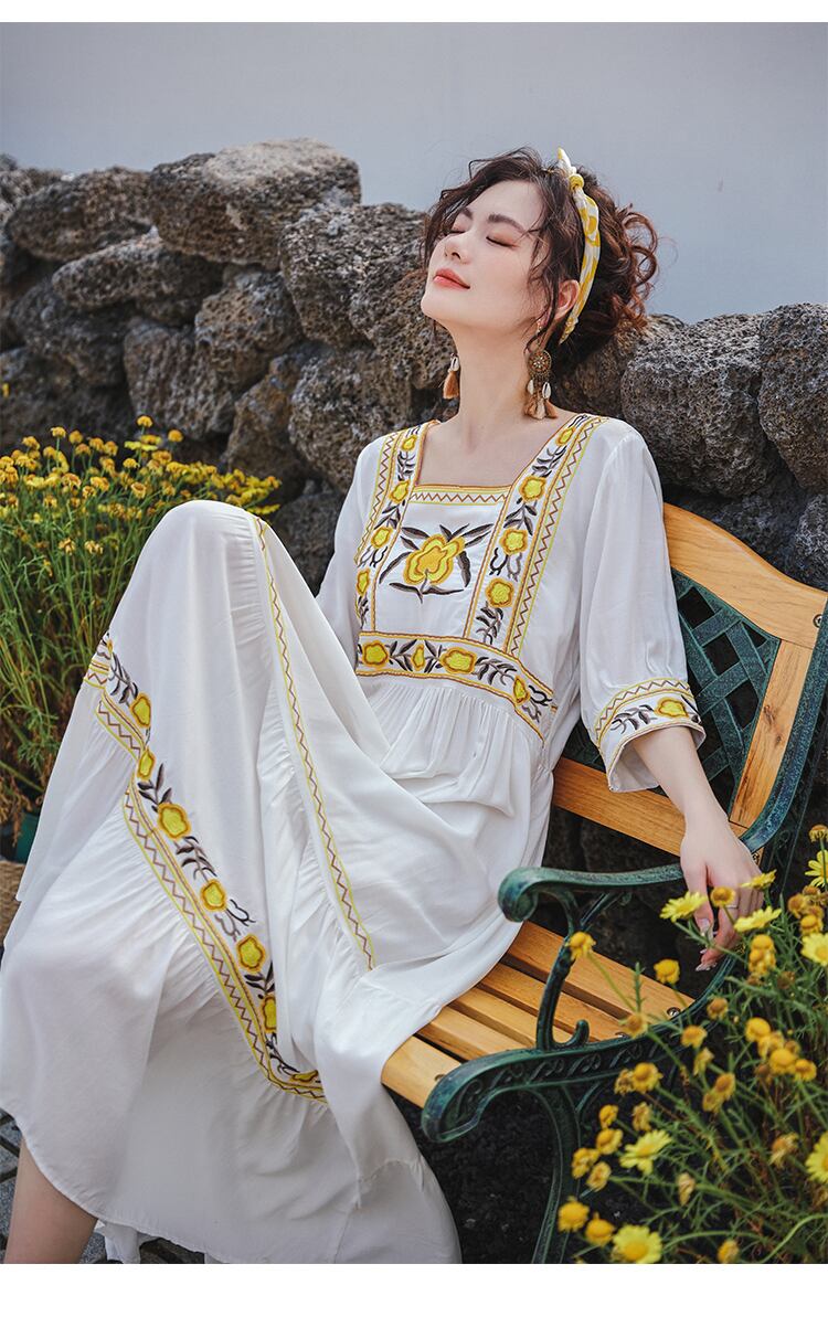 繊細刺繍ボヘミアンマキシビーチホリデードレススクエアカラー半袖ルーズロングドレス ショート レッド ハーフスリーブ スクウェア