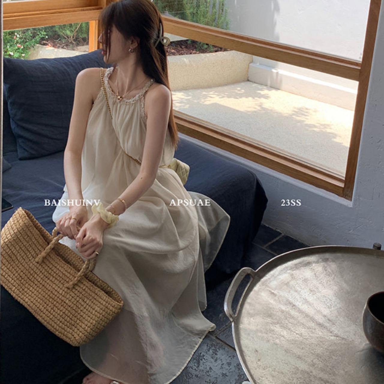 Y2K シックでストラップロングドレス O ネックノースリーブルーズスリムカジュアルサマードレス 夏物 Oネック ソリッドカラー