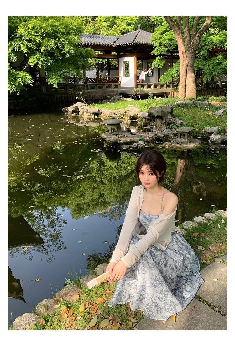 Y2K 中国風花水墨画因果ドレス夏セクシー背中開いたスリムロングストラップレスドレス サマー 夏物 花柄 長めのストラップ