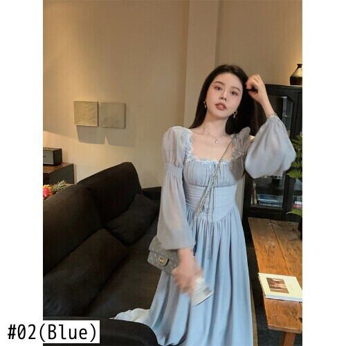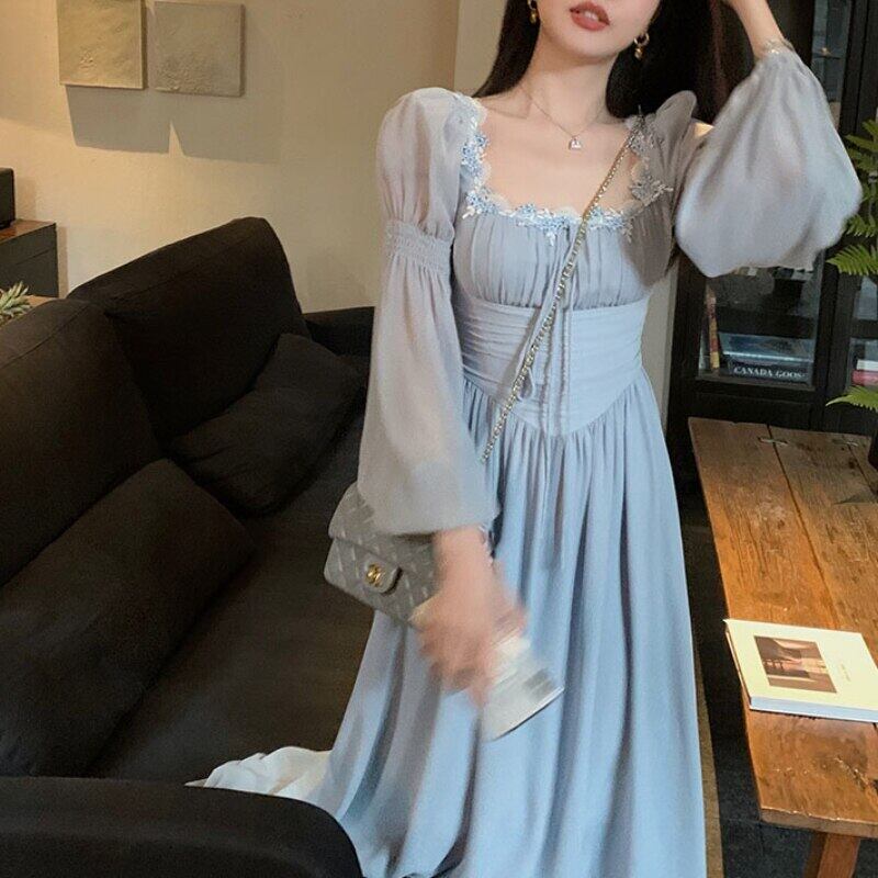 フレンチシックとスクエアネックスイングパーティードレス夏ロングランタンスリーブレースアップチュニック妖精ドレス サマー 夏物 スクウェア