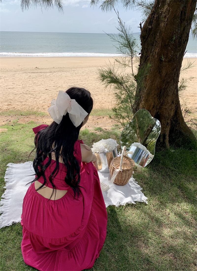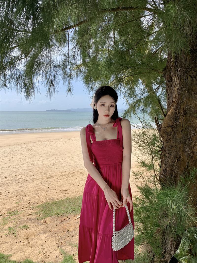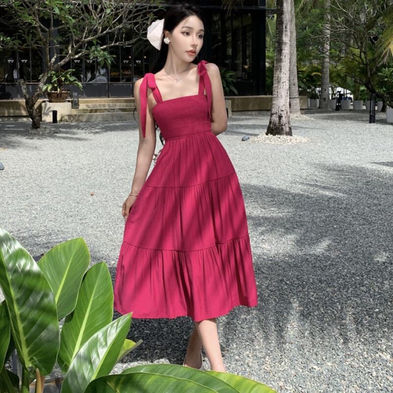 シックローズレッドレースアップドレスミニマリストピュアスリムセクシーノースリーブサマースタイル妖精ロングサンドレス 夏物