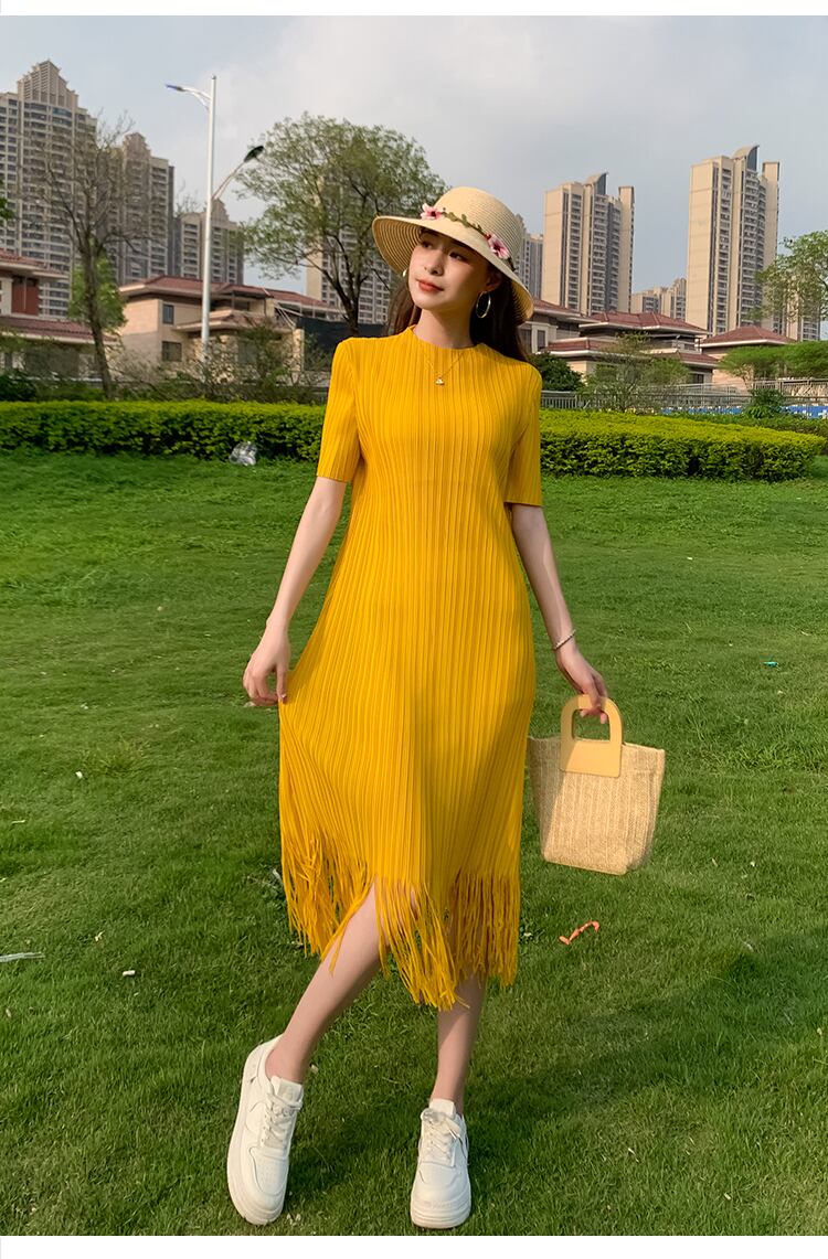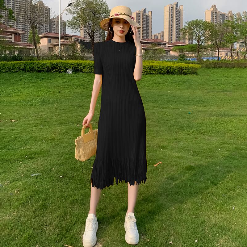 三宅プリーツシックソリッドカラーテルミディドレス O ネック半袖スリムドレス ショート ハーフスリーブ Oネック