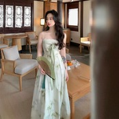 中国風改良漢服ツーピースセット衣装: ルーズグリーンカーディガン + シック竹葉プリントロングドレス漢服セット