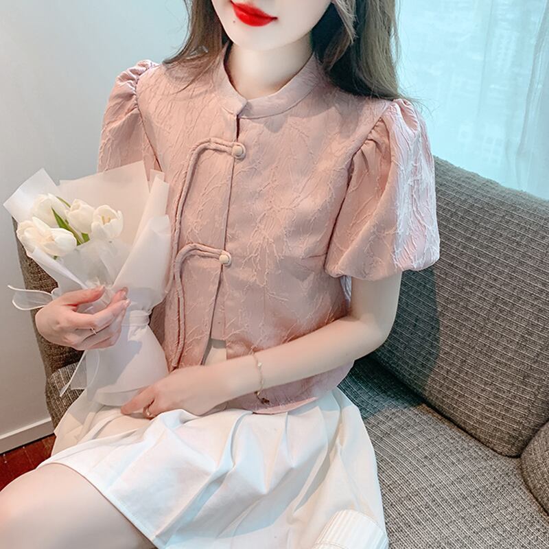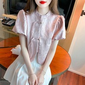 中国風改良チャイナドレストップシックジャカードレースアップボタンピンクパフスリーブブラウス