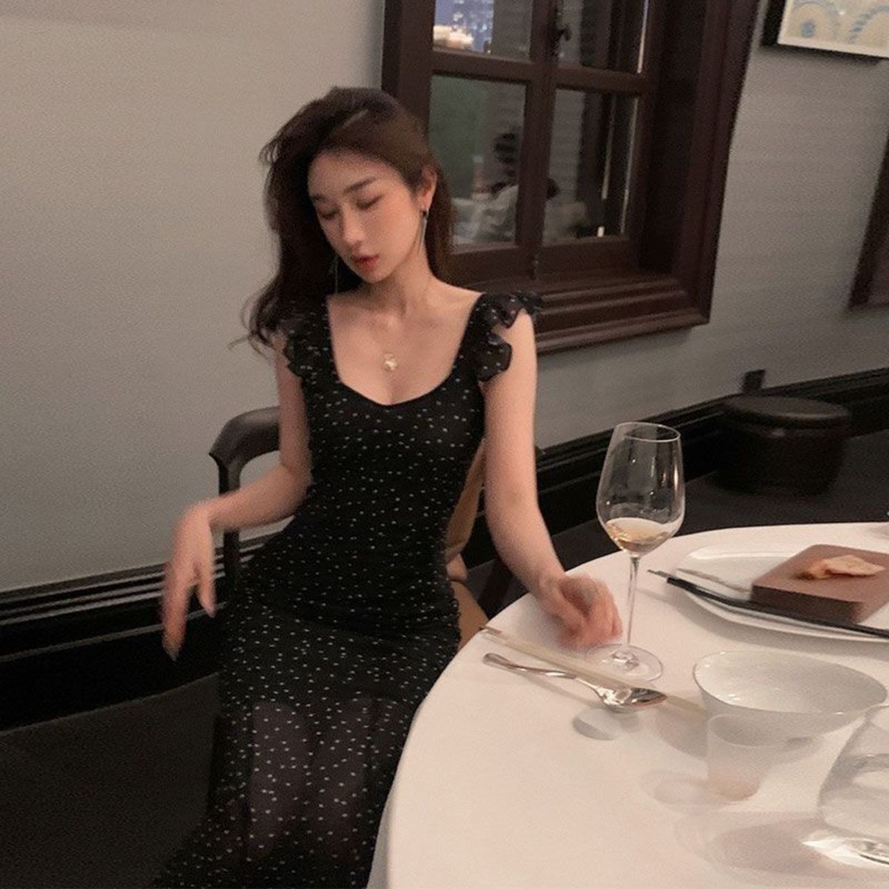 Clic 水玉シフォンサスペンダーパーティードレス夏スクエアネックフリルスカートセクシーロングドレス サマー 夏物 スクウェア