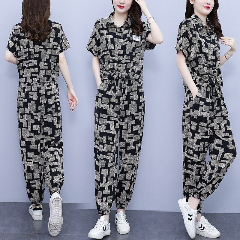 シックレタープリント黒ツーピースセット衣装: ターンダウン襟半袖ブラウス + ウエストハーレムパンツ 2 ピースレディースセット ショート ブラック ハーフスリーブ