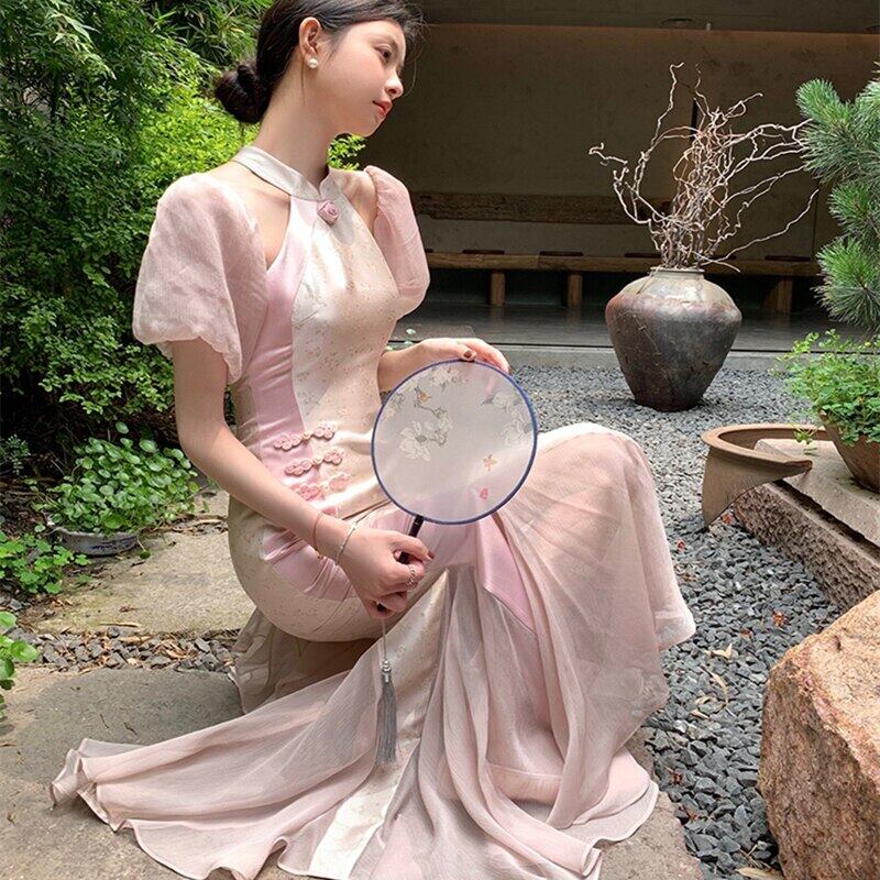 中国風シックマーメイドテールチャイナドレス夏レトロバックルスリムパーティードレス サマー 夏物