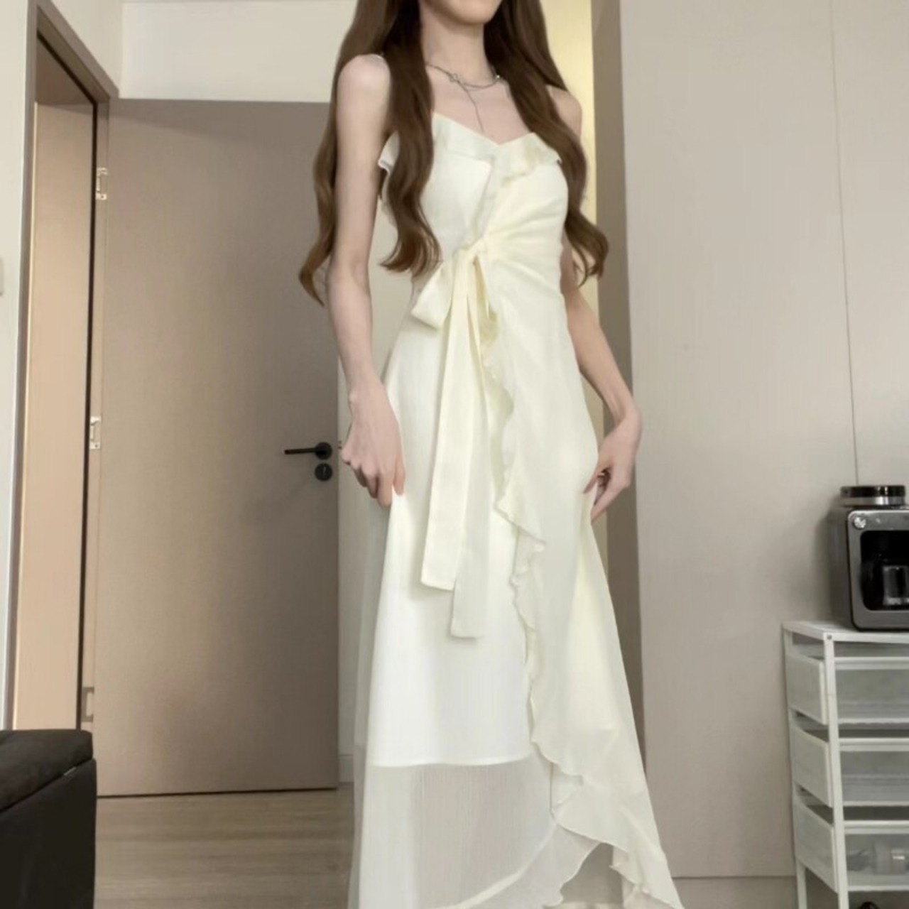 シックフリル V ネックミッドレングススリングドレス夏スクエアカラーバックレスドレス サマー 夏物 Vネック スクウェア